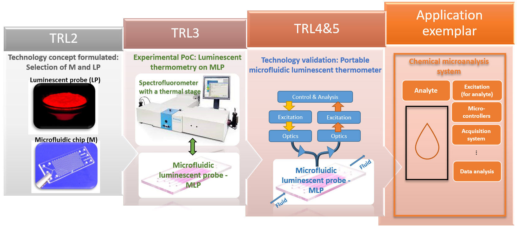 A portable microfluidic luminescent thermometer composed of appropriate optical/electronic components and MLP will be developed and validated for both point and 2D temperature measurements.